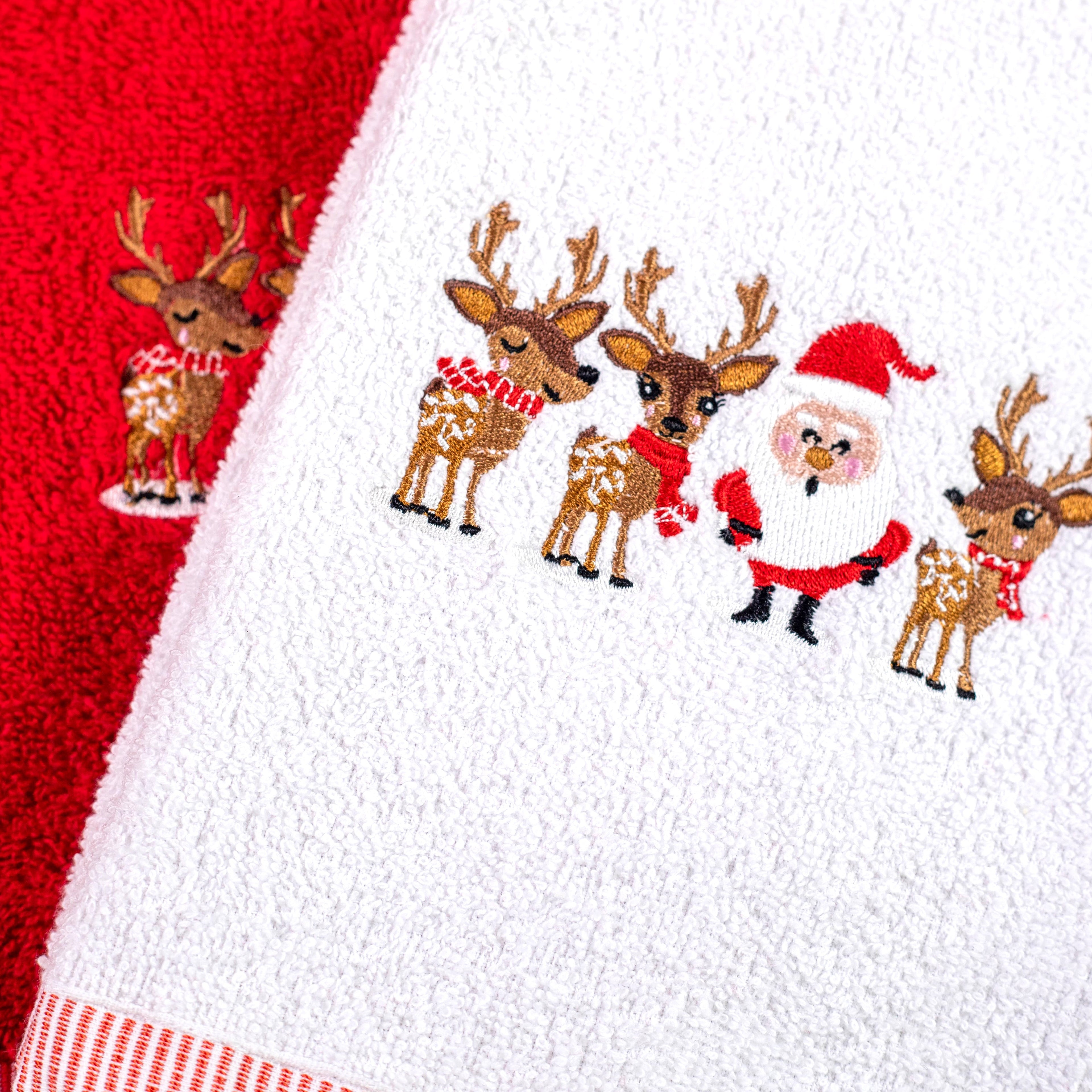 The stunningly detailed embroidery adds a fun touch to these super soft cotton towels. Choose from two stylish designs: Santa and his Reindeer, or a sleek Snowflake pattern.
