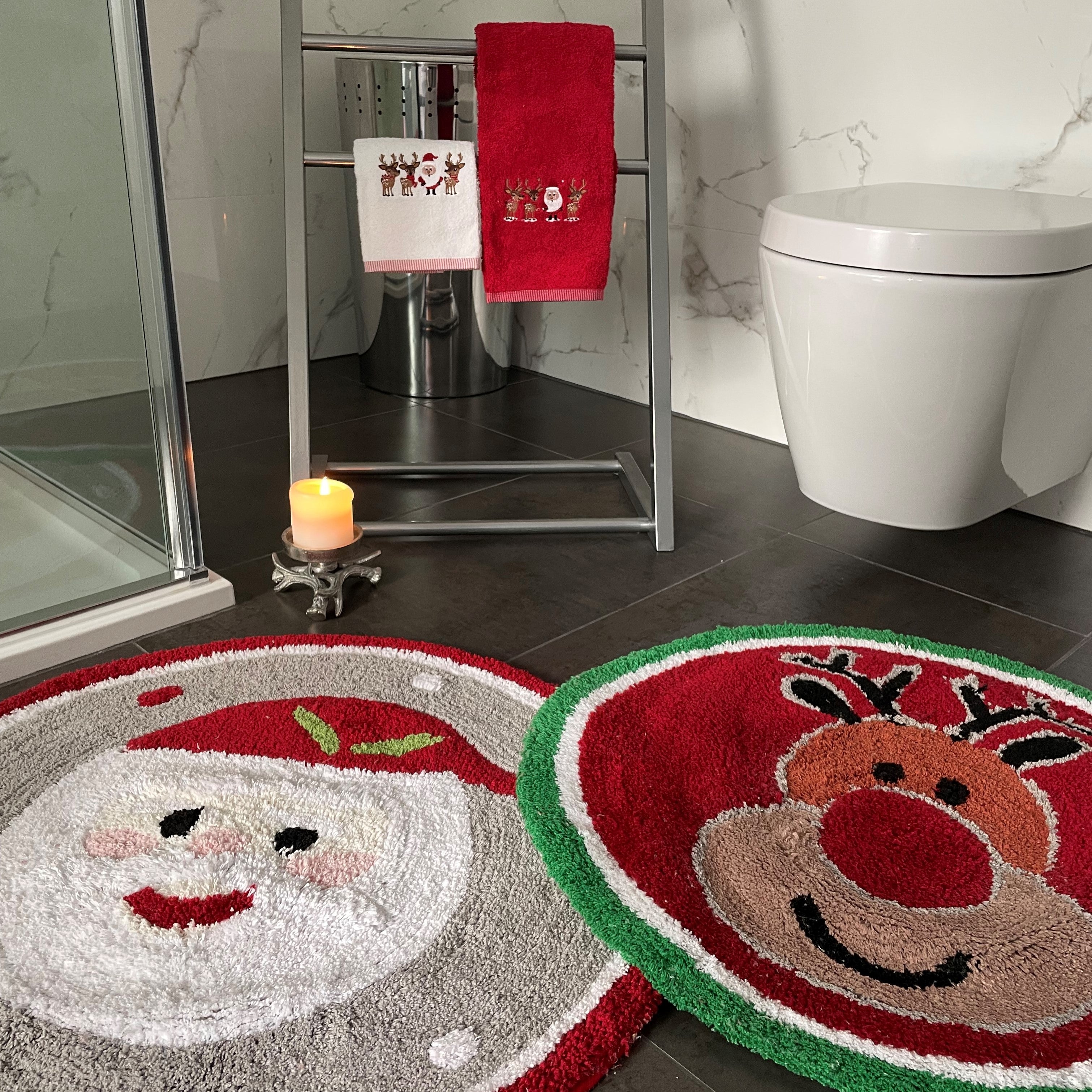 Or instead, keep your feet warm and away from cold tiles during the colder months with a soft Christmas Round Mat: available in two designs.